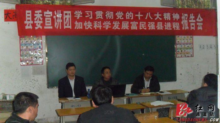 通道新闻网讯:2012年12月18日下午,由县委宣传部龙宪忠副部长带队的宣讲团到大高坪苗族乡进行十八大精神宣讲。全乡领导班子全体成员、全体乡村干部、苗寨村民代表、老党员共计120余人参加了此次宣讲。