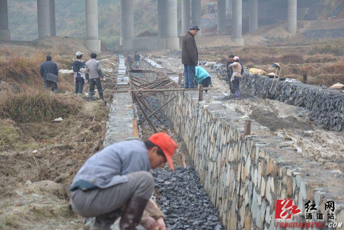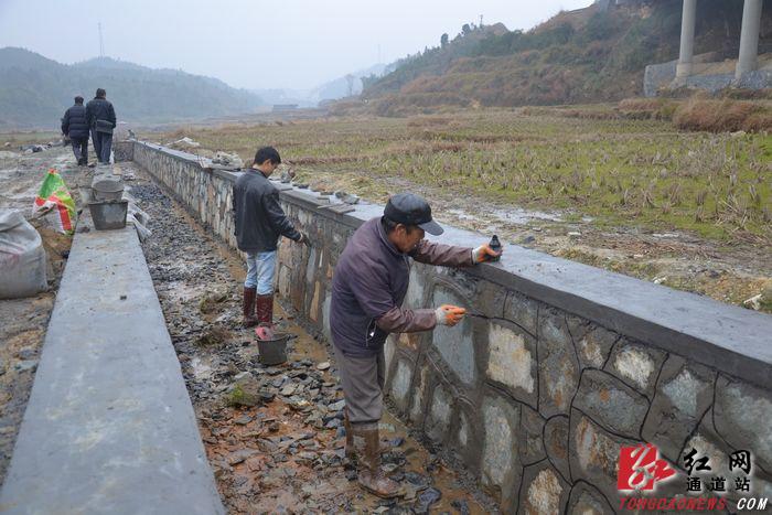 马龙村排水渠建设已接近尾声,施工人员正在紧锣密鼓建设。老师傅手法娴熟,正在用毛笔着墨在渠壁上进行勾缝工作,使渠道更坚固也更美观大方。