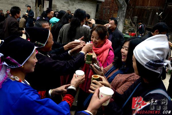 通道新闻网讯:11月12日,通道侗族自治县坪坦乡高团村又迎来一批远方游客。20多名来自北京的旅游者走进侗寨,被这方神奇的自然山水所吸引,享受到百里侗文化长廊那神秘的民俗风情,感受到通道神圣的红色印迹.体验侗族同胞原生态的文化和生活。侗家人以特有的待客礼节,将侗族芦笙、打糍粑、侗族大歌,多耶篝火等向客人们展示、与客人们分享了原生态合拢宴。游客们真切地感受到‘’全国民间文化艺术之乡‘’的生态、文化和民俗的独特魅力。