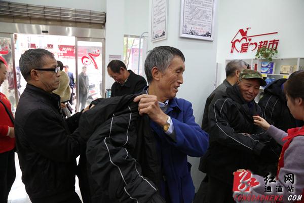在捐赠仪式上,志愿者向困难群众代表送上捐赠的棉衣,表达深切的慰问和祝福。
