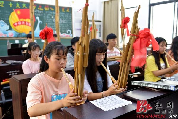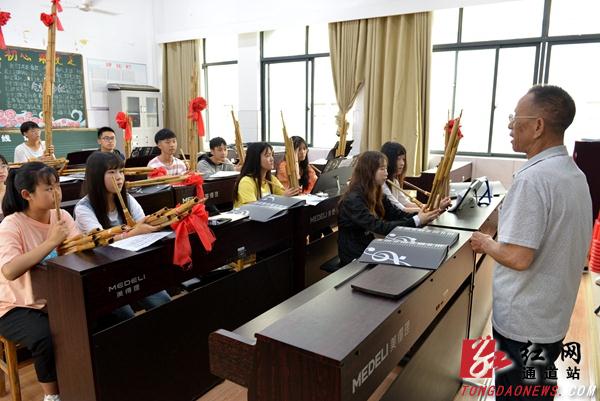 通道新闻网讯:6月9日, 在县职中校园内,国家级非物质文化遗产项目侗锦织造技艺省级代表性传承人吴念姬,侗族芦笙省级代表性传承人石喜富正在给学生上课,学生们在传承人手把手的教授下,时而在织机上穿纱引线,时而吹起芦笙,传承侗族传统文化。