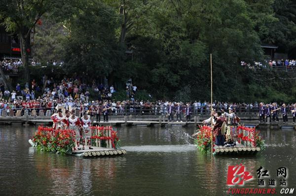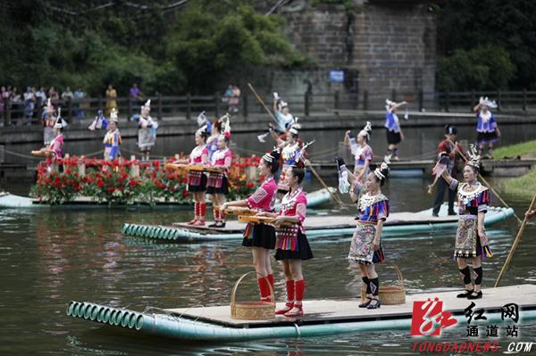 8月21日,在坪坦乡皇都侗文化村坪坦河畔,2020红色旅游博览会通道分会场《侗听天籁》大型实景演出精彩上演,吸引了省内外游客观赏。
