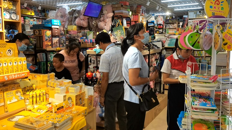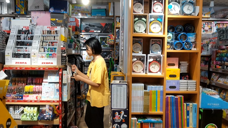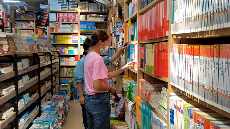在县城的一家书店,柜台上分门别类的摞满了各种本子、铅笔、橡皮擦、钢笔、水彩笔、书套等文具,紧跟市场潮流的盲盒文具等新产品让人眼前一亮;在教辅专区,工具书被摆放在显眼位置,练习簿、课外读物等也整齐地陈列在各个货架上,不少学生和家长正在细心挑选学习用品。
