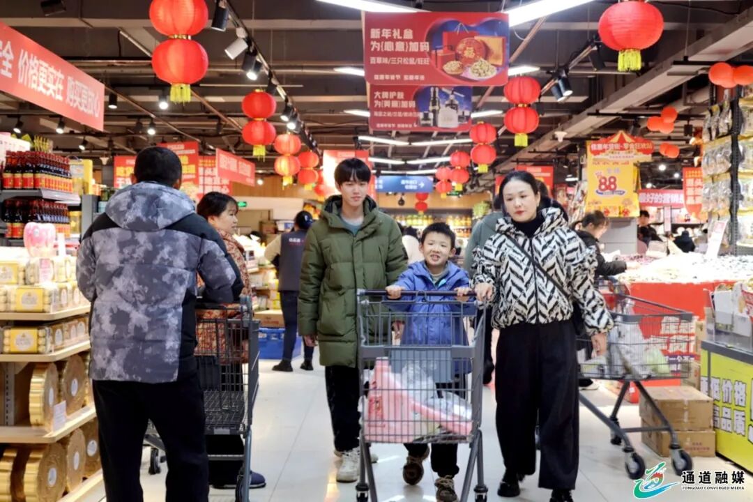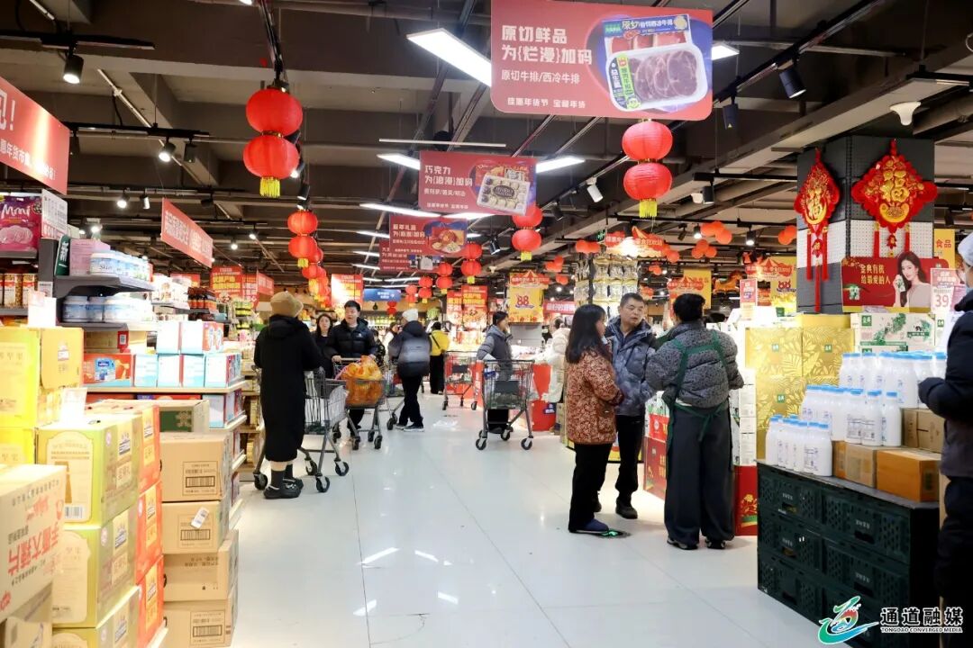 通道融媒2月13日讯:春节临近,年味渐浓,城区各大商超、年货集市全面开启“春节模式”,市民携家带口前来置办年货,红火热闹的购物场景里,处处洋溢着喜庆祥和的浓厚节日氛围。