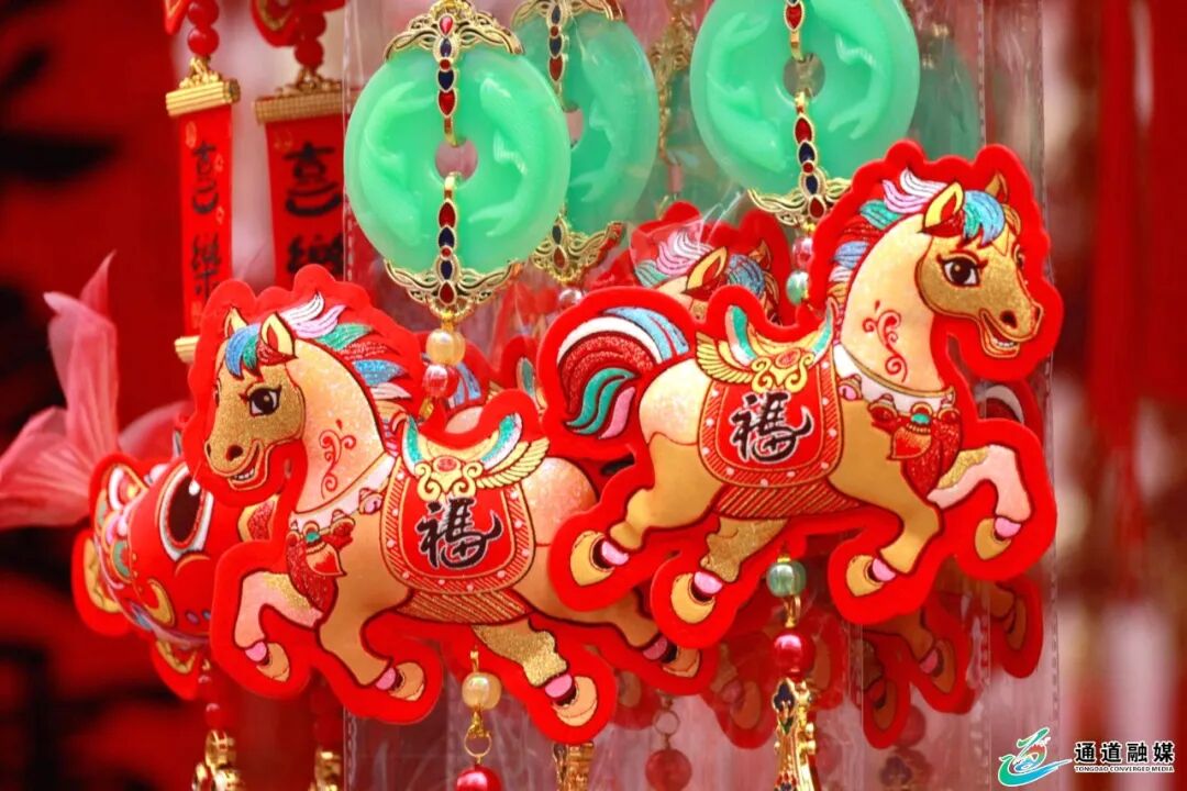 在城东大市场,年味更是扑面而来。春联福字、红灯笼、窗花挂件等年俗年货琳琅满目,春联喜庆热烈,融入“马”元素的特色福字、挂件、摆件摆放在摊位显眼位置,造型别致、寓意吉祥,吸引不少市民驻足挑选、询价购买。