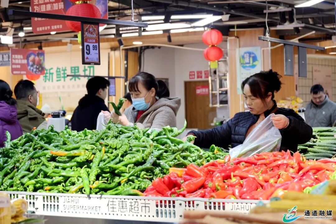 在城区大型超市内,生鲜区、年货专区人头攒动、购销两旺。货架上新鲜果蔬色泽鲜亮、品类齐全,各类生猪肉禽分割规整、供应充足,坚果炒货、糖果等商品成为市民置办年货的首选。