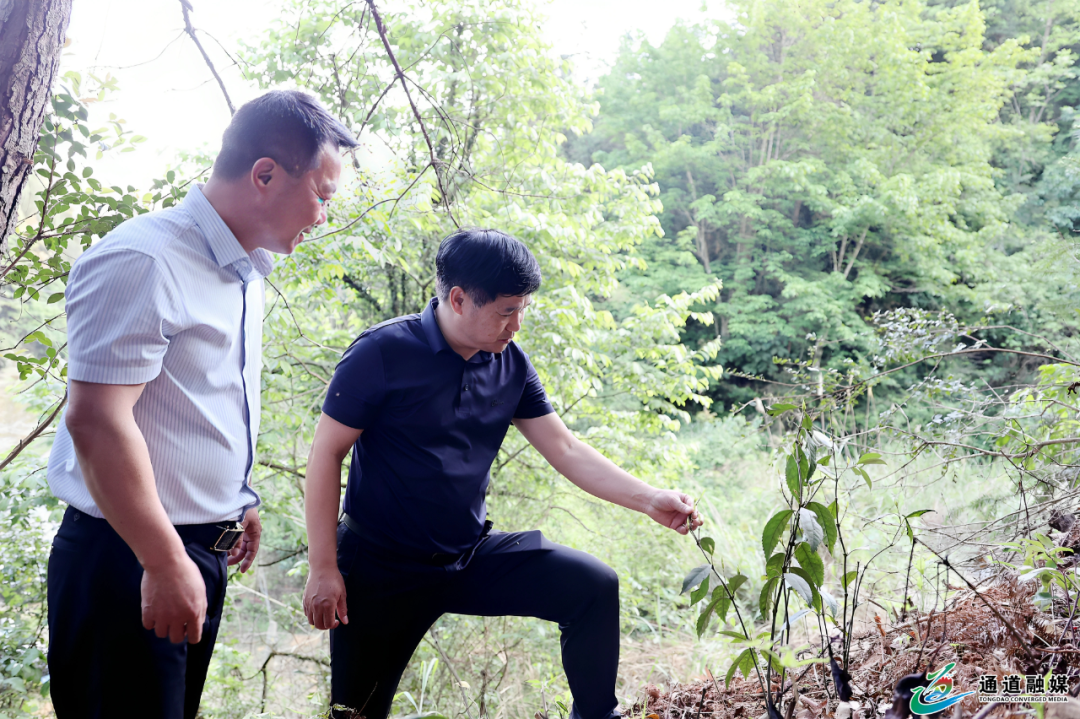 (覃歇民在县溪镇多星村枫杨里中药材种植基地察看五指毛桃、淫羊藿等药材长势)