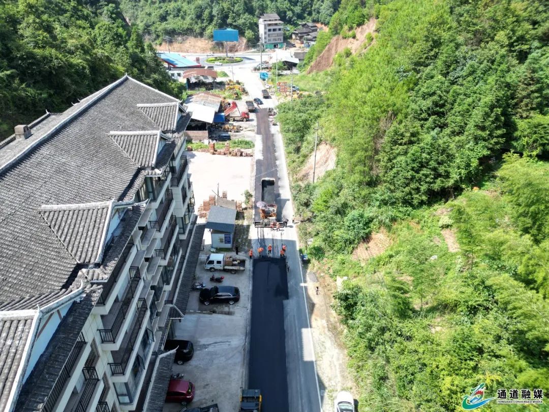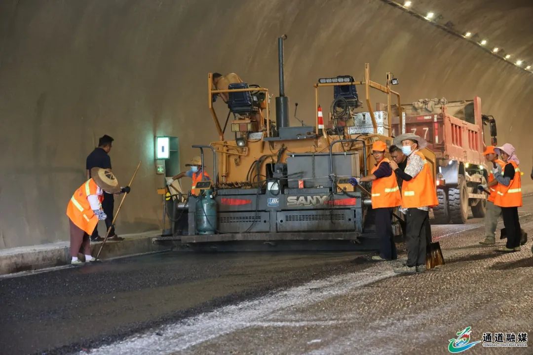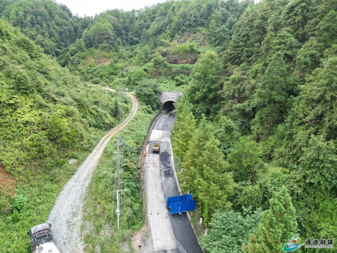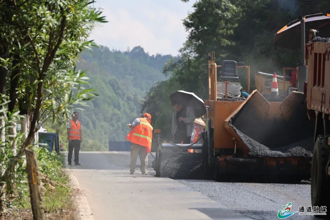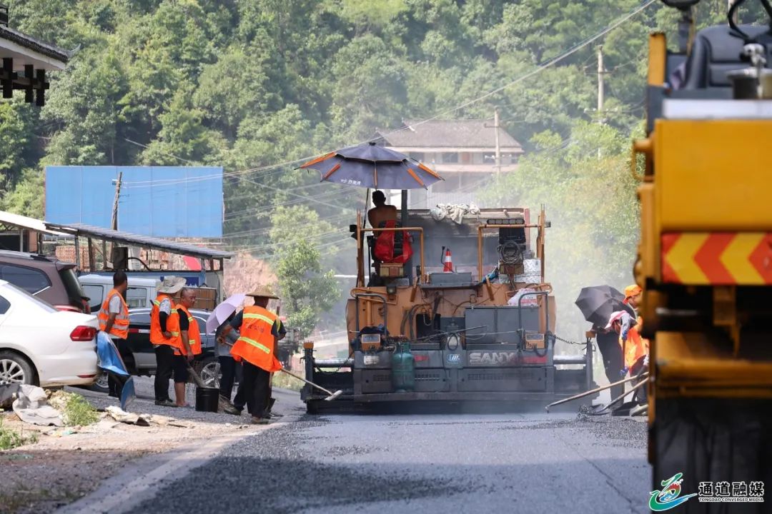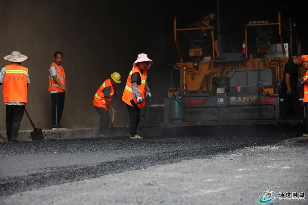 通道融媒8月11日讯:8月9日,G209国道独岩隧道路段机器轰鸣,县公路建设养护中心的养护工人们冒着高温,正紧张有序地进行沥青摊铺作业。